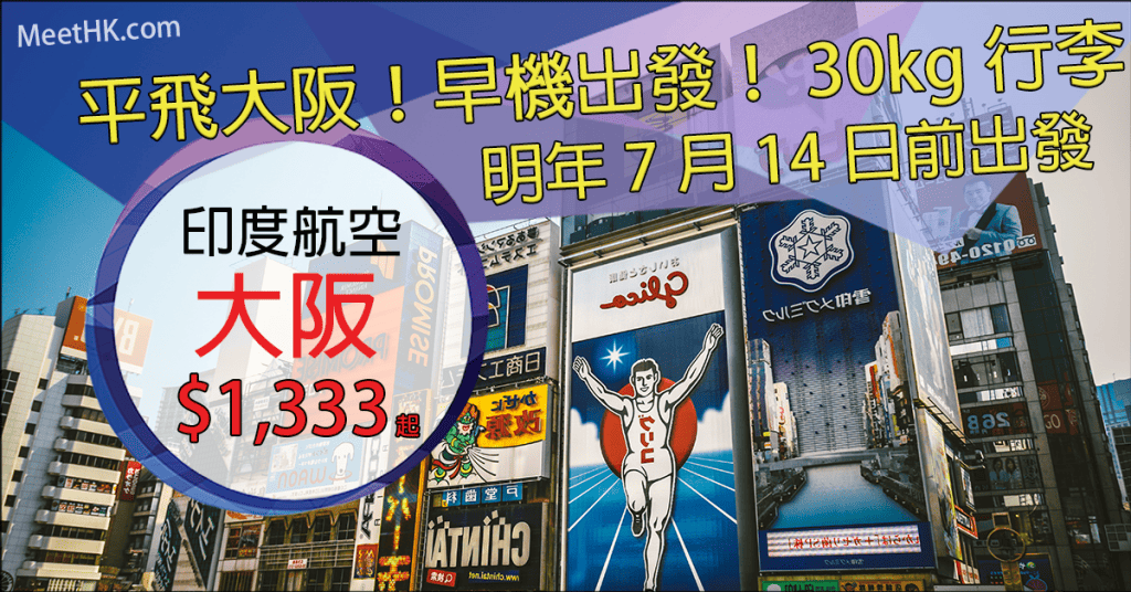 平飛大阪!早機出發!30kg行李!明年7月14日前出發!香港往返大阪只需$1,333起 – 印度航空