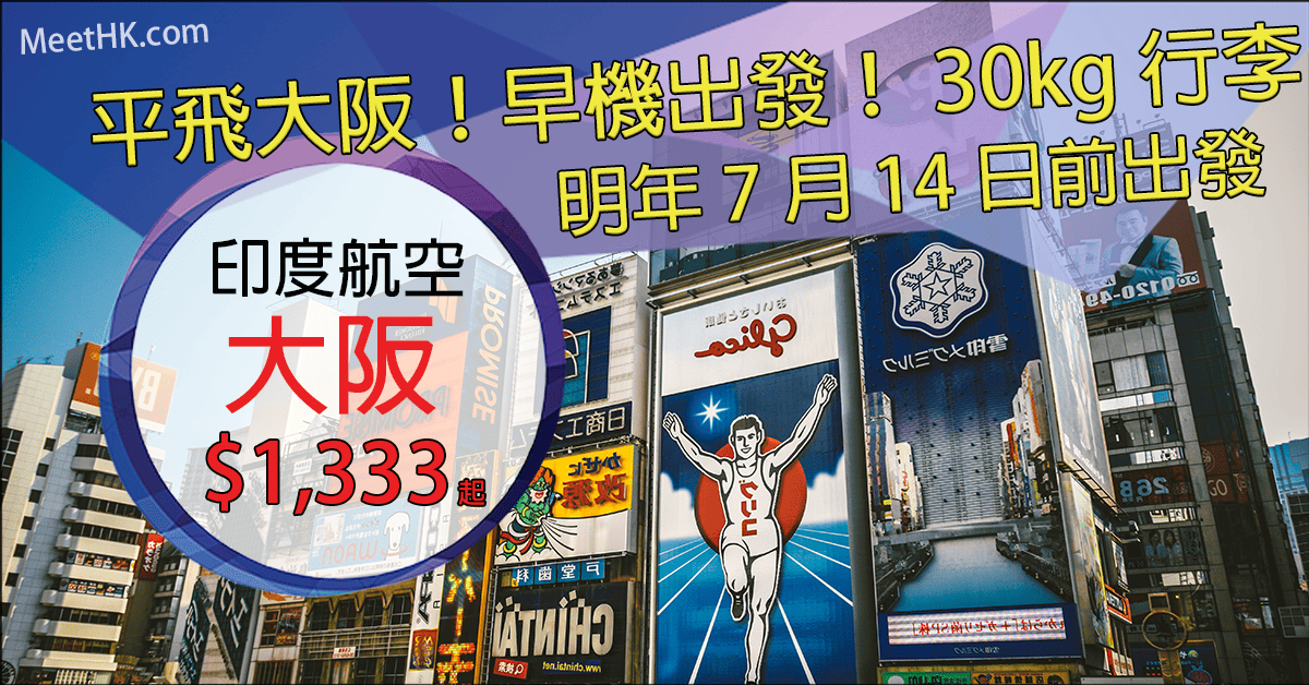 平飛大阪!早機出發!30kg行李!明年7月14日前出發!香港往返大阪只需$1,333起 – 印度航空