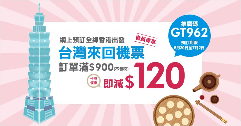 限時3日!全線台灣機票齊齊減$120!港航飛台北$370,華航飛台北$696,國泰飛台灣$775起 – 永安旅遊 (優惠至7月2日)