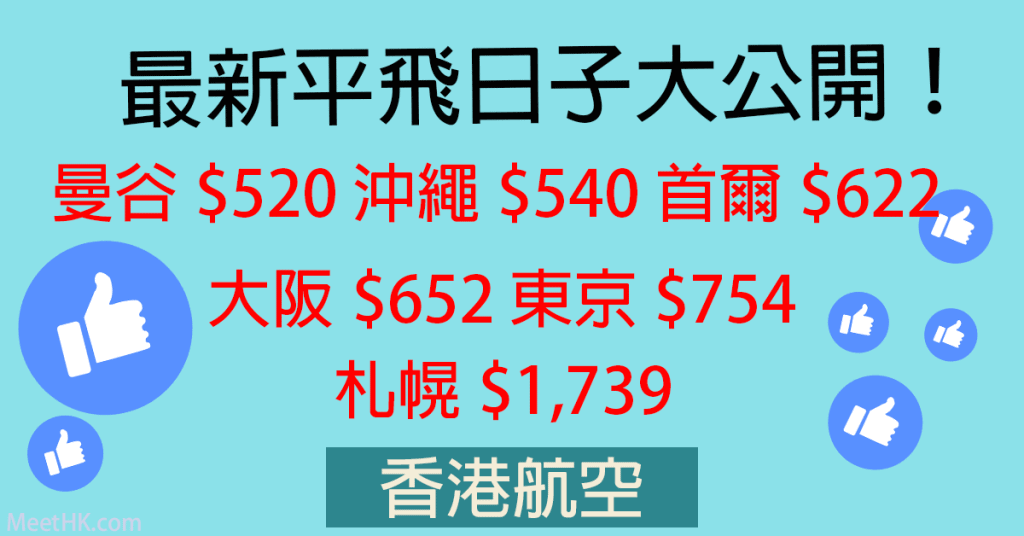 最新平飛日子大公開!港航Mega Sale即搶!曼谷$520、沖繩$540、首爾$622、大阪$652、東京$754、札幌$1,739 – 香港航空 (優惠至7月3日)