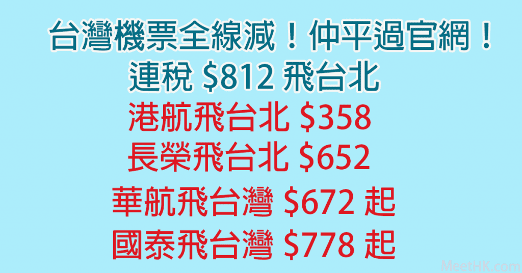 台灣機票全線減!仲平過官網!連稅$812飛台北!港航飛台北$358,長榮飛台北$652,華航飛台灣$672起,國泰飛台灣$778起 – Wefly.com.hk (優惠至7月5日)