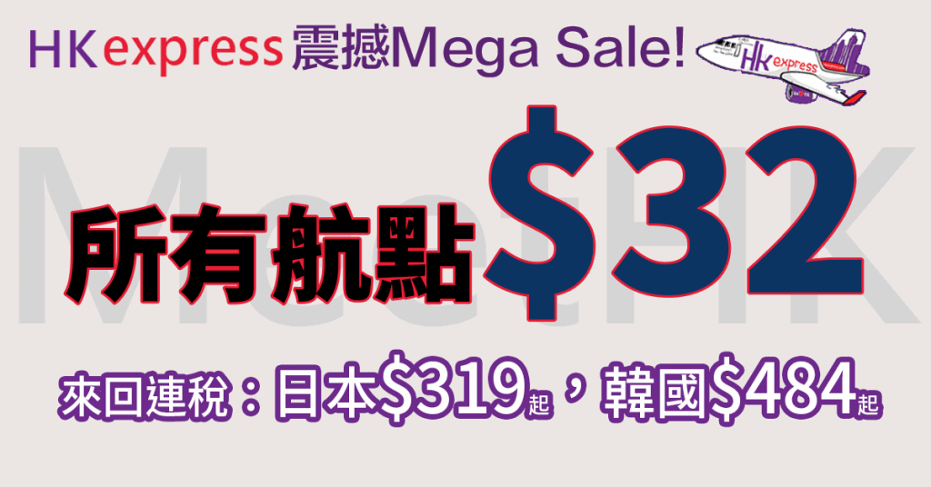 嘩嘩嘩!全線$32 Mega Sale!Tag埋所有朋友一齊搶!所有航點單程只需$32 – HK Express (優惠至7月7日)