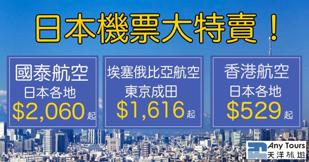 日本機票大特賣!港航飛日本$529起;國泰飛日本來回只需$2,060起;埃塞俄比亞航空飛東京$1,616起 – Any Tours天洋旅遊