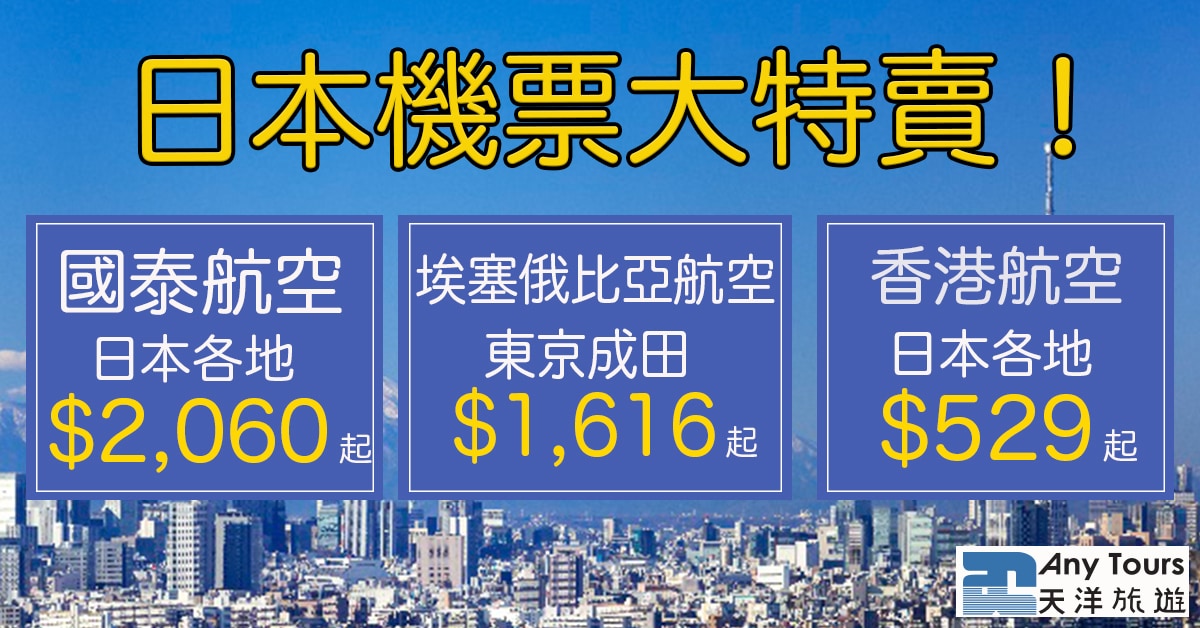 日本機票大特賣!港航飛日本$529起;國泰飛日本來回只需$2,060起;埃塞俄比亞航空飛東京$1,616起 – Any Tours天洋旅遊