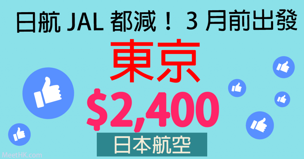 嘩!日航JAL都減!明年3月前出發!兩件各23kg行李!香港往返東京二人同行每人只需$2,400 – 日本航空