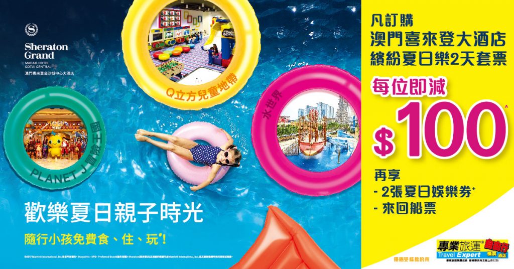 澳門夏日激讚優惠!同行小童尊享免費食住玩禮遇!澳門喜來登夏日繽紛樂套票2日1夜 (酒店+來回船飛) 每人只需HK$849起!送夏日娛樂券 – 專業旅運