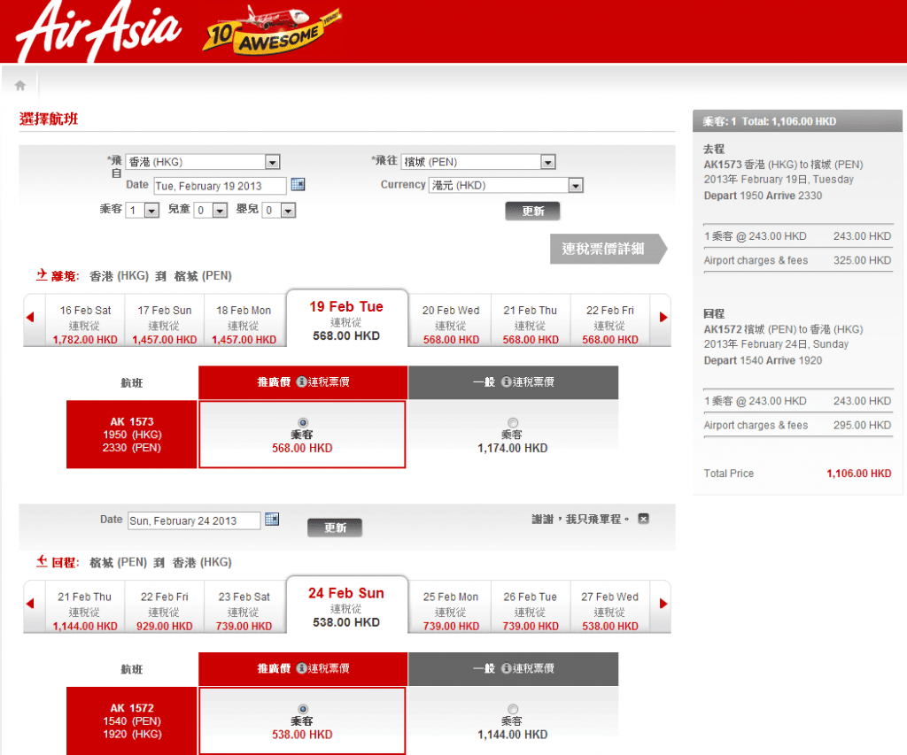 經我們測試,以檳城2月19日出發,2月24日返回為例