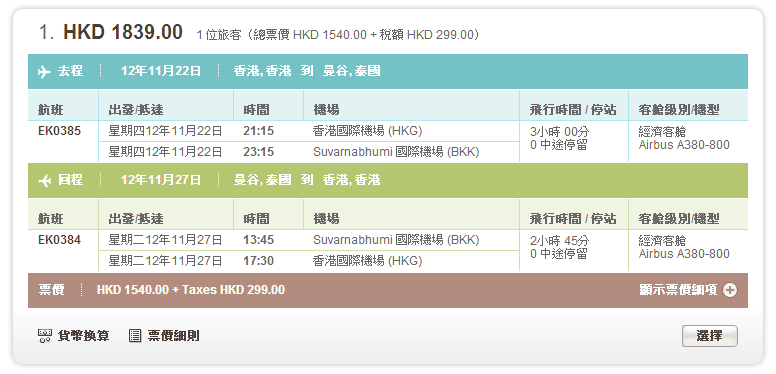 經我們測試,以曼谷11月22日出發,11月27日返回為例