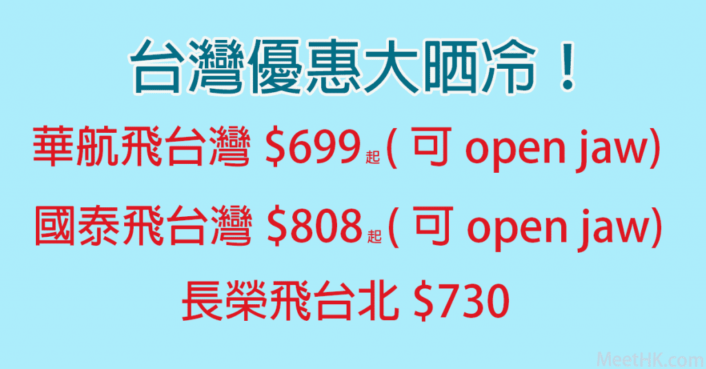 台灣優惠大晒冷!華航飛台灣$699起(可open jaw),國泰飛台灣$808起(可open jaw),長榮飛台北$730 – Wefly.com.hk (優惠至7月12日)