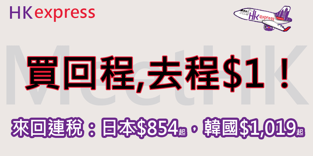 買回程,去程$1!今晚12點開賣!香港飛台灣/東南亞來回$249起,日本各地$329起,首爾/釜山/濟州$369起 – HK Express (優惠至7月21日)