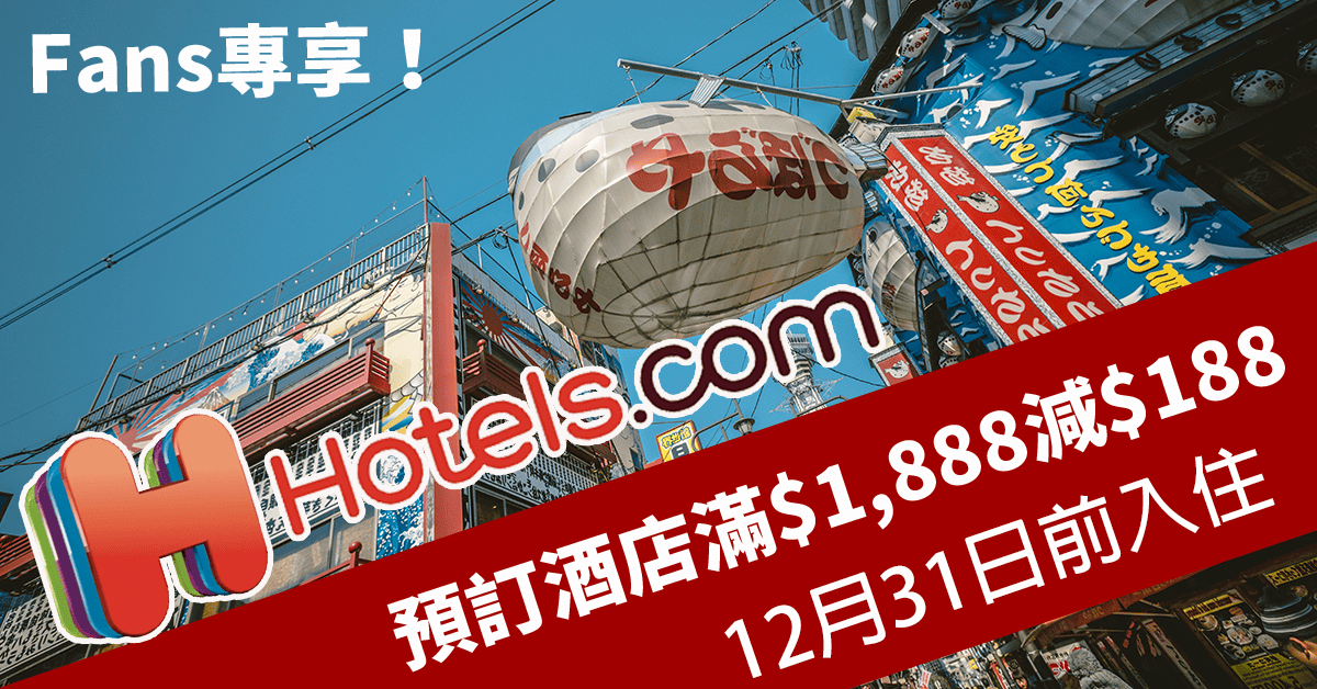 大家憑以下優惠代碼係Hotels.com香港網站預訂酒店滿$1,888減$188折扣優惠