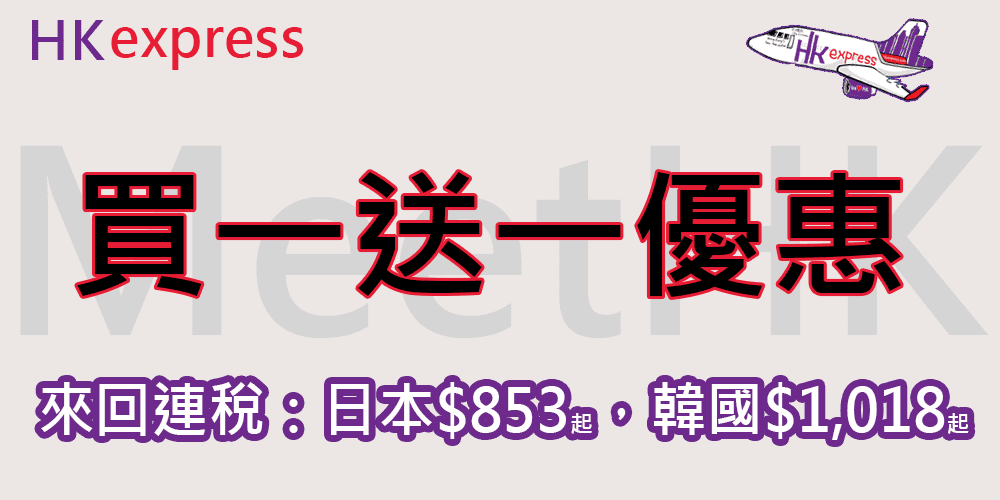 買一送一優惠!今晚12點開賣!香港飛台灣/東南亞單程$164起,首爾/釜山/濟州$299,日本各地$299起 – HK Express (優惠至7月27日)