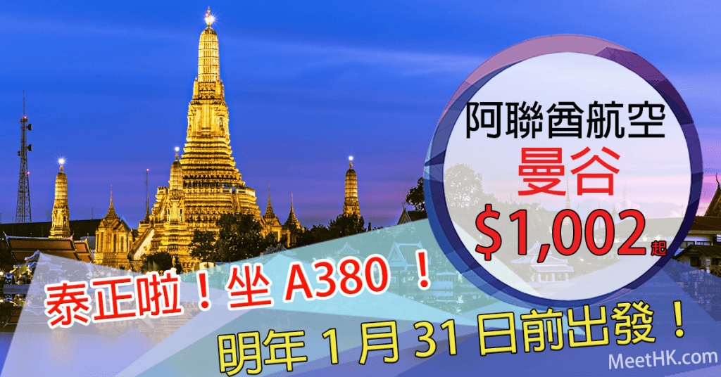 泰正啦!坐A380!明年1月31日前出發!香港往返曼谷只需$1,002起 – 阿聯酋航空 Emirates (優惠至7月28日)