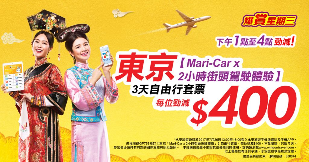 永安旅遊會係明天(7月26日)下午1點推出限時3小時東京Mari-Car自由行套票每人減$400優惠,不限名額