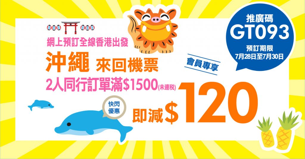 香港出發到沖繩2人同行來回機票滿$1,500(未連稅)每單即減$120推廣碼:GT093