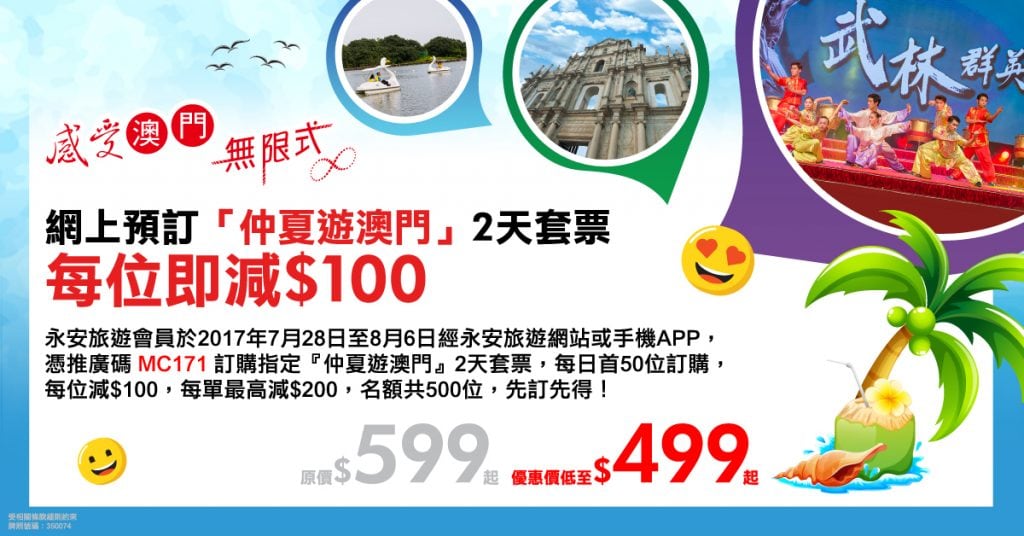 永安旅遊推出【仲夏遊澳門】2日1夜套票每人減$100優惠