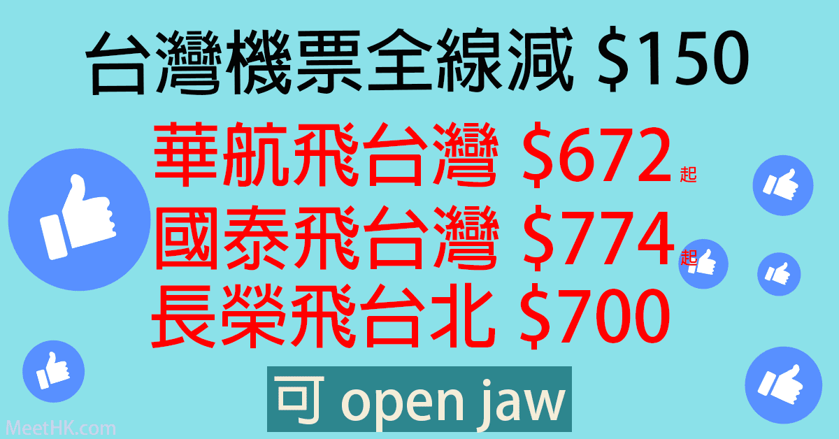 台灣優惠大晒冷!華航飛台灣$672起(可open jaw),國泰飛台灣$774起(可open jaw),長榮飛台北$700 – Wefly.com.hk (優惠至8月2日)