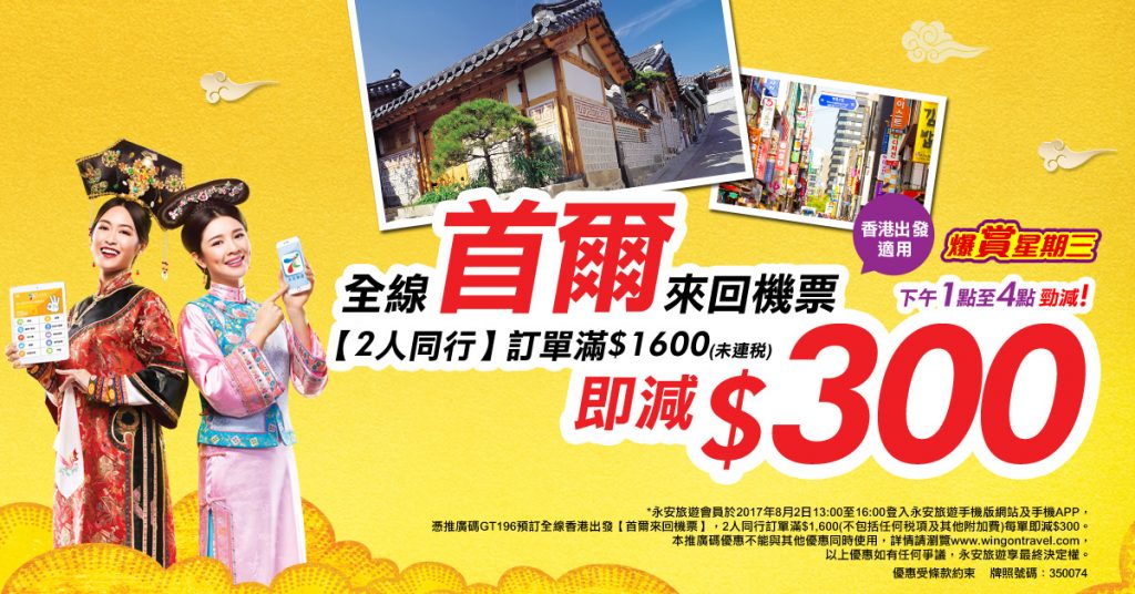 全線香港出發來回首爾機票滿$1,600(未連稅)每單即減$300推廣碼:GT196