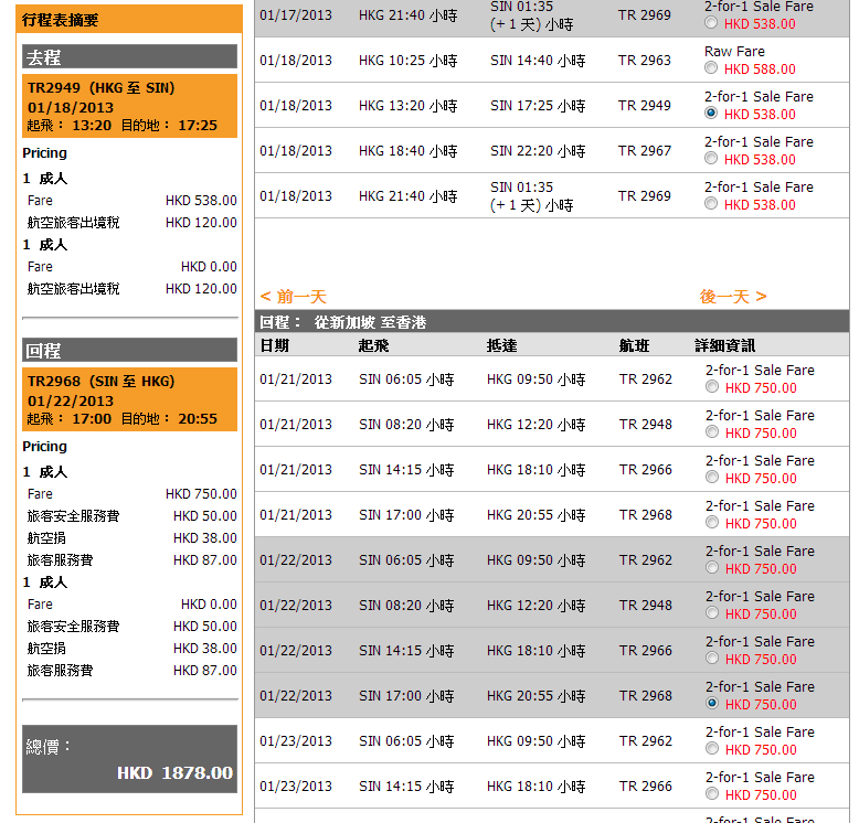 香港往返新加坡來回連稅除返每人只需$939起 (以二人同行計,去程最平$538,回程最平$750,稅就每人$295)