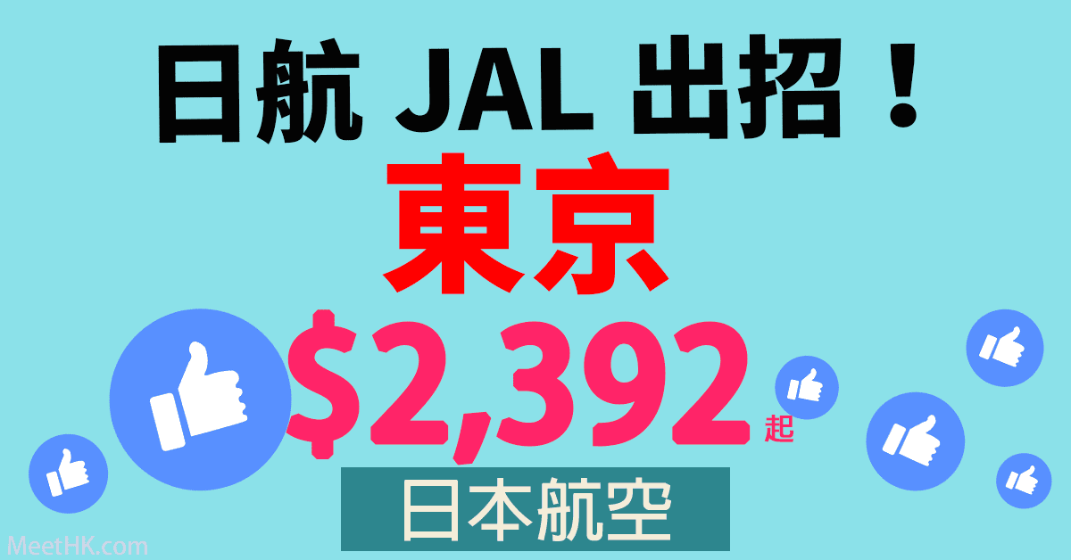 日航JAL出招!12月19日前出發!兩件各23kg行李!香港往返東京只需$2,392起 – 日本航空 (優惠至8月31日)