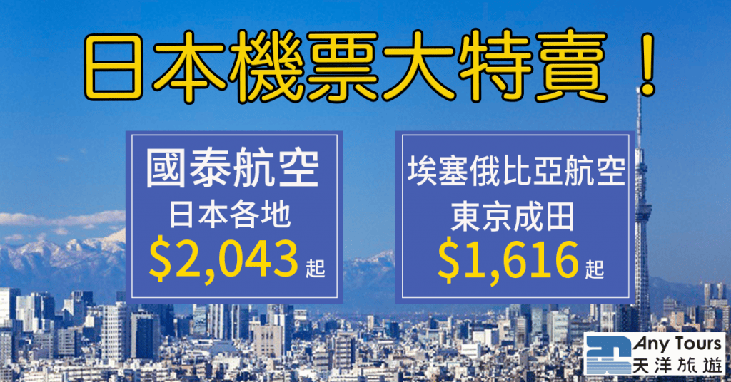 日本機票大特賣!國泰飛沖繩來回只需$2,043起,東京/大阪/名古屋$2,196起、札幌$3,705起;埃塞俄比亞航空飛東京$1,616起 – Any Tours天洋旅遊