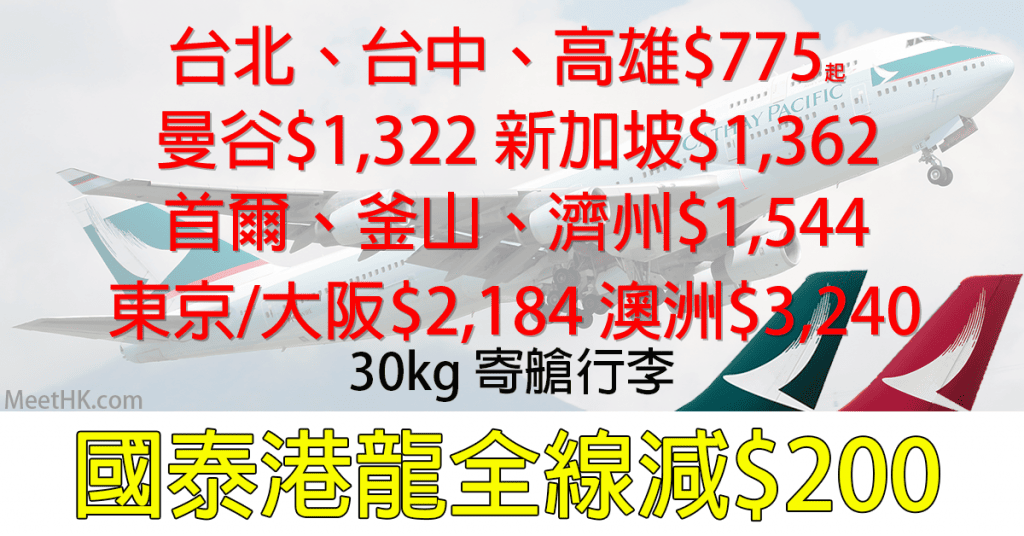 國泰/港龍全線減$200!30kg行李!台灣$775起,曼谷$1,322,新加坡$1,362,首爾/釜山/濟州$1,544,東京/大阪$2,184,澳洲$3,240 – Wefly.com.hk (優惠至8月6日)