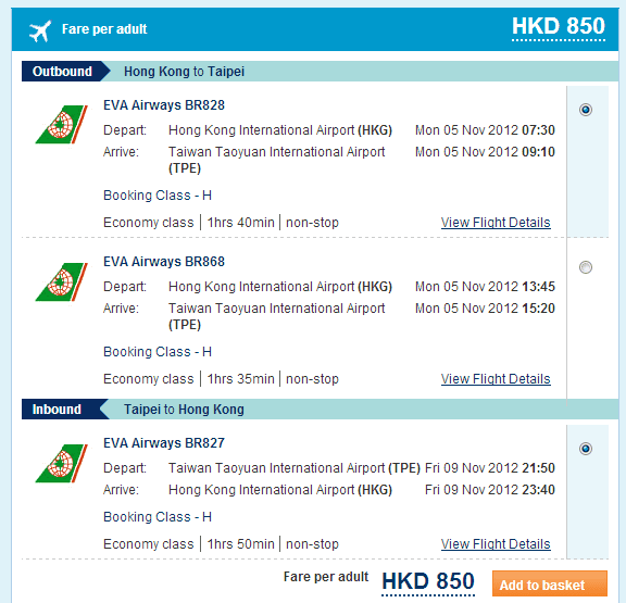 香港往返台北二人同行每人只需$850,連埋稅都只係$1,543,抵玩