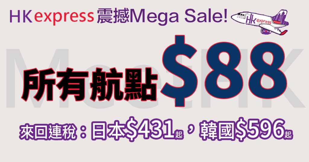 嘩嘩嘩!全線$88 Mega Sale!Tag埋所有朋友一齊搶!所有航點單程只需$88 – HK Express (優惠至8月11日)