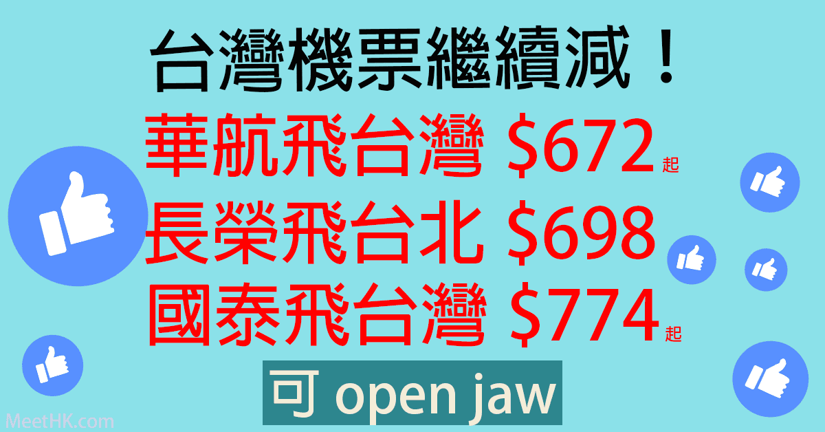 台灣機票繼續減!華航飛台灣$672起(可open jaw),長榮飛台北$698,國泰飛台灣$774起(可open jaw) – Wefly.com.hk (優惠至8月9日)