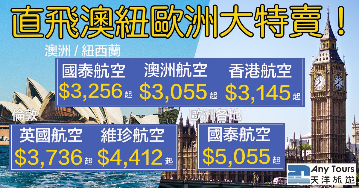 直飛澳紐歐洲機票大特賣!香港直飛澳洲各地只需$3,055起,奧克蘭$3,145起,倫敦$3,736起,歐洲各地$5,050起 – Any Tours天洋旅遊