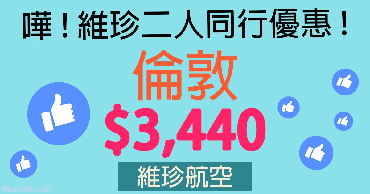維珍都減!二人同行優惠!明年5月31日前出發!香港直航往返倫敦只需$3,440起 – 維珍航空 (優惠至9月4日)
