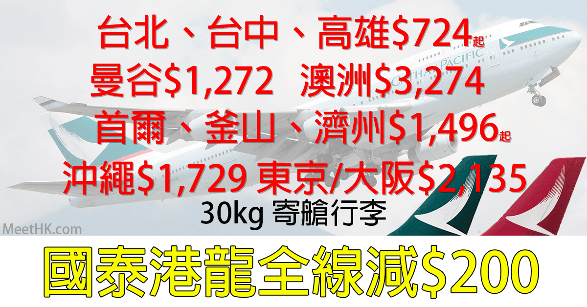 配合GoGoGo!全線國泰/港龍機票每張激減$200優惠