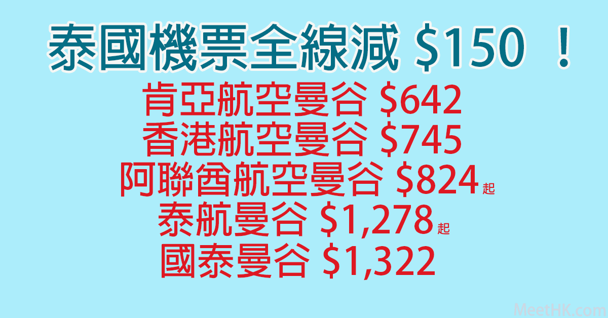 泰抵飛!泰國機票全線減$150!全年優惠!曼谷$642(肯亞航空),$745(港航)、$824起(阿聯酋航空),$1,278(泰航),$1,322(國泰) – Wefly.com.hk (優惠至8月13日)