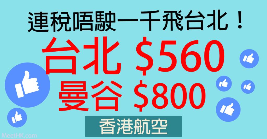 抵呀!連稅唔駛一千飛台北!香港往返台北只需$560、曼谷$800、首爾Business Class$2,800 – 香港航空 (優惠至8月16日)