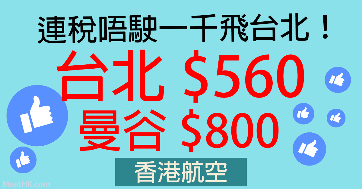 抵呀!連稅唔駛一千飛台北!香港往返台北只需$560、曼谷$800、首爾Business Class$2,800 – 香港航空 (優惠至8月16日)