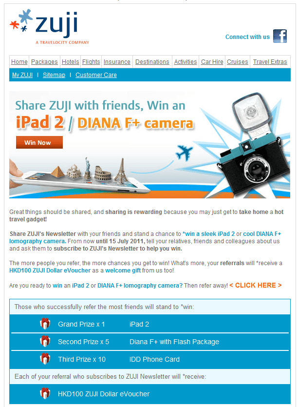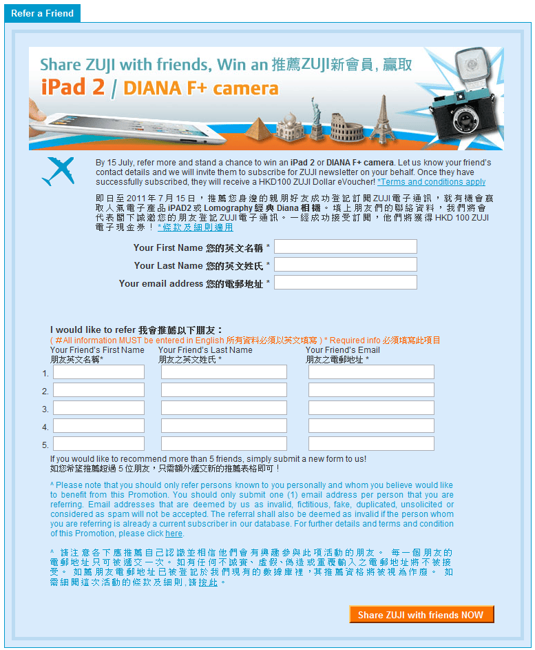 即 日 至 2011 年 7 月 15 日 , 推 薦 您 身 邊 的 親 朋 好 友 成 功 登 記 訂 閱 ZUJI 電 子 通 訊 , 就 有 機 會 贏 取 人 氣 電 子 產 品 iPAD2 或 Lomography 經 典 Diana 相 機 。 填 上 朋 友 們 的 聯 絡 資 料 , 我 們 將 會 代 表 閣 下 誠 邀 您 的 朋 友 登 記 ZUJI 電 子 通 訊 。 一 經 成 功 接 受 訂 閱 , 他 們 將 獲 得 HKD 100 ZUJI 電 子 現 金 券 !