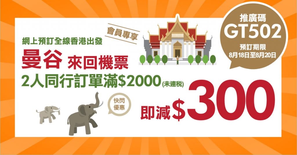 香港出發到曼谷2人同行來回機票滿$2,000(未連稅)每單即減$300推廣碼:GT502