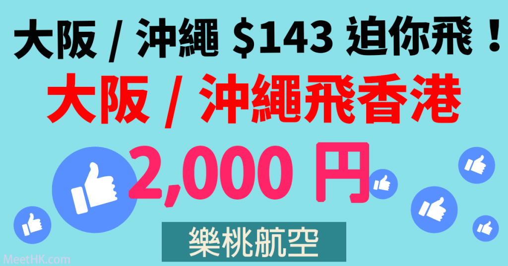 大阪、沖繩飛香港單程2,000円(約$143)