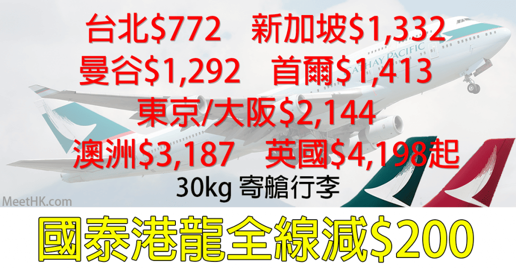 國泰/港龍全線減$200!30kg行李!台北$772,新加坡$1,332,曼谷$1,292,首爾$1,413,東京/大阪$2,144,澳洲$3,187,英國$4,198起 – Wefly.com.hk (優惠至9月1日)
