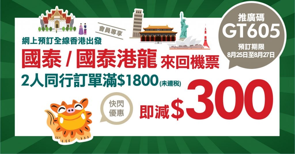 國泰/國泰港龍香港出發來回機票2人同行滿$1,800(未連稅)每單即減$300推廣碼:GT605