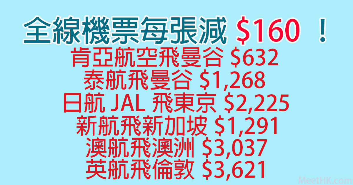 全線機票每張減$160!肯亞航空飛曼谷$632,泰航飛曼谷$1,268,日航JAL飛東京$2,225,新航飛新加坡$1,291,澳航飛澳洲$3,037,英航飛倫敦$3,621 – Wefly.com.hk!(優惠至8月28日)