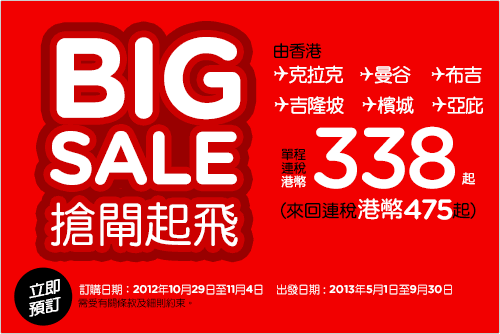今日凌晨(10月29日0:00) AirAsia又有BIG SALE啦,今次開賣明年5月至9月出發既機票,呢段日子係九月中既Big Sale已經賣過