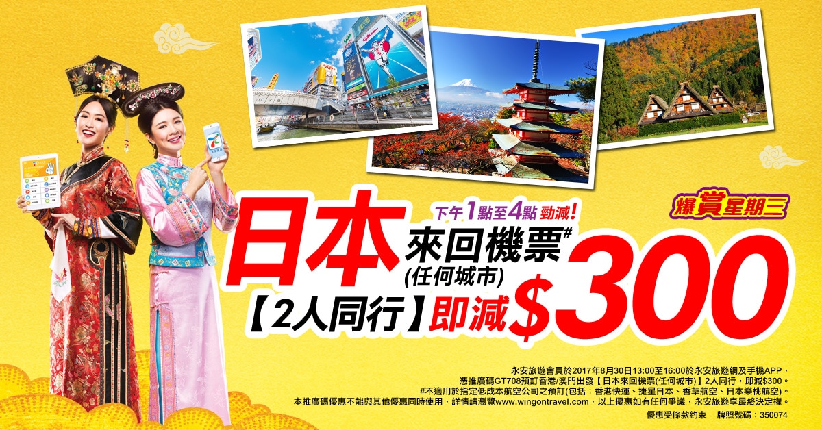 永安旅遊會係明天(8月30日)下午1點推出限時3小時日本任何城市來回機票減$300優惠,不限名額