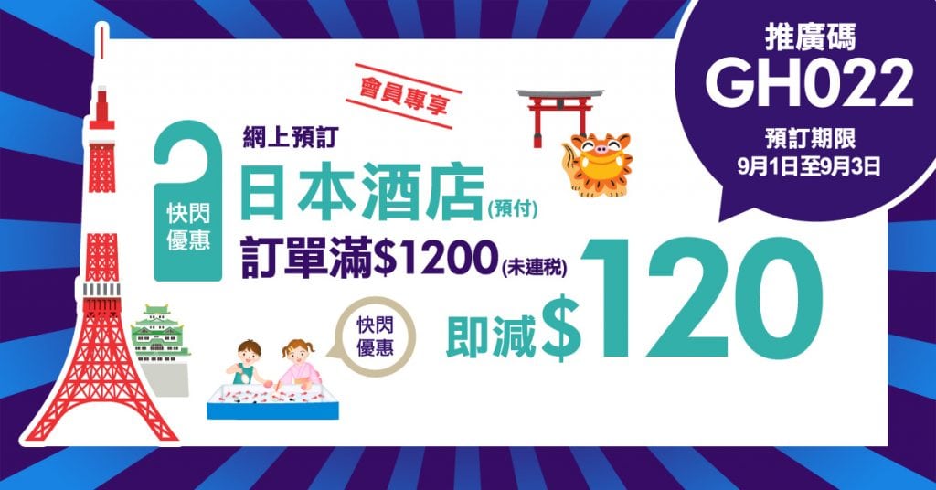 日本酒店有得減!限時3日!預訂東京/大阪/京都/名古屋/神戶/福岡/熊本/鹿兒島/沖繩那霸/札幌酒店滿$1,200即減$120 – 永安旅遊 (優惠至9月3日)