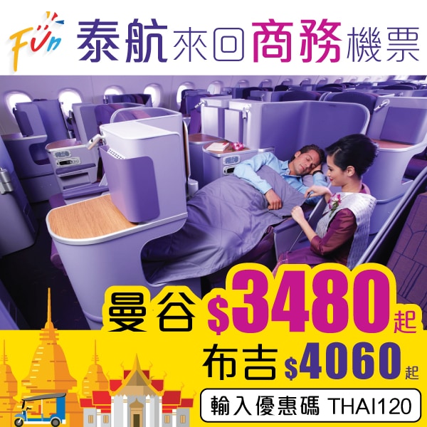 泰航Business Class飛曼谷/布吉每張減$120優惠代碼:THAI120