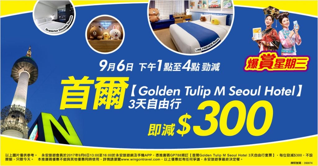 永安旅遊會係聽日(9月6日)下午1點推出限時3小時首爾Golden Tulip M Seoul Hotel套票每位減$300優惠,不限名額