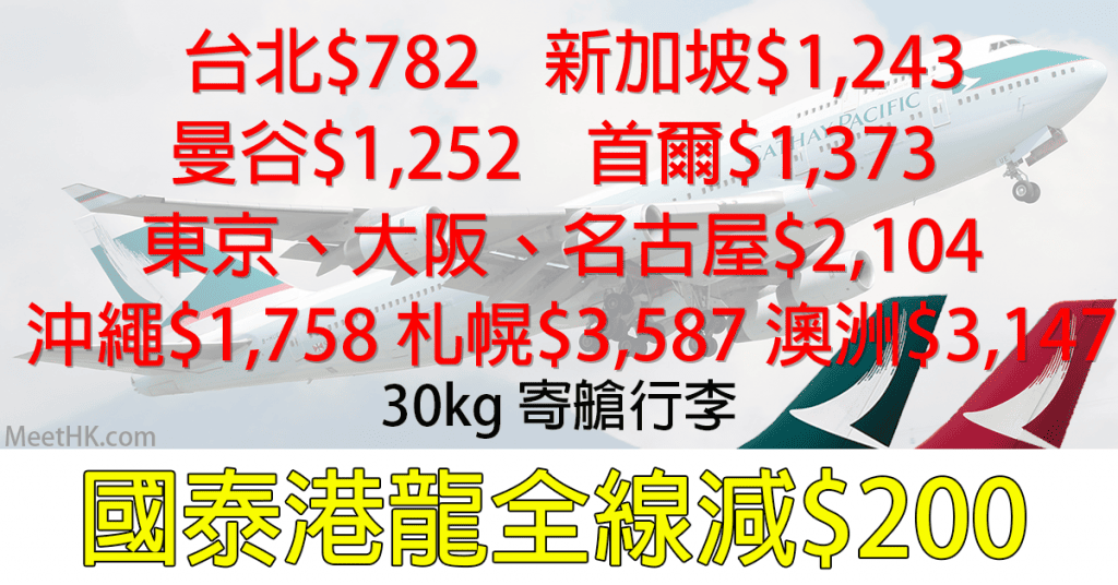 國泰/港龍全線減$200!30kg行李!台北$782,新加坡$1,243,曼谷$1,252,首爾$1,373,沖繩$1,758,東京/大阪/名古屋$2,104,札幌$3,587,澳洲$3,147 – Wefly.com.hk (優惠至9月9日)