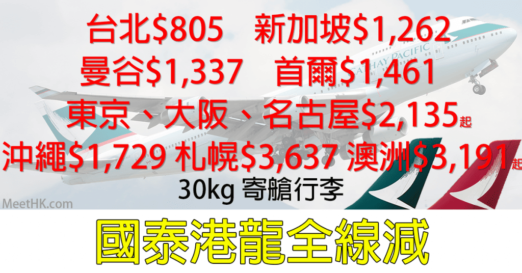 國泰/港龍全線減!30kg行李!台北$805,新加坡$1,262,曼谷$1,337,首爾$1,461,沖繩$1,729,東京/大阪/名古屋$2,135起,札幌$3,637,澳洲$3,191起 – GoGoGo! (優惠至9月13日)