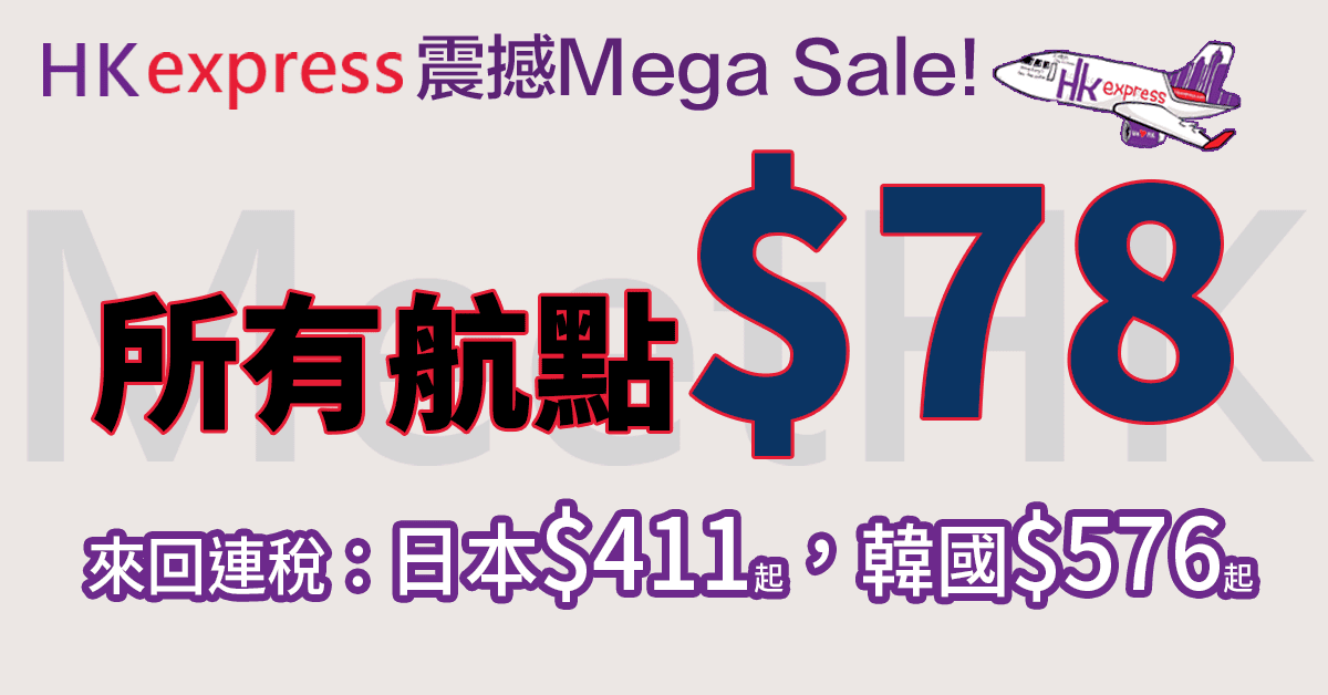 嘩嘩嘩!全線$78/$88 Mega Sale!Tag埋所有朋友今晚12點一齊搶!所有航點單程只需$78/$88 – HK Express (優惠至9月22日)