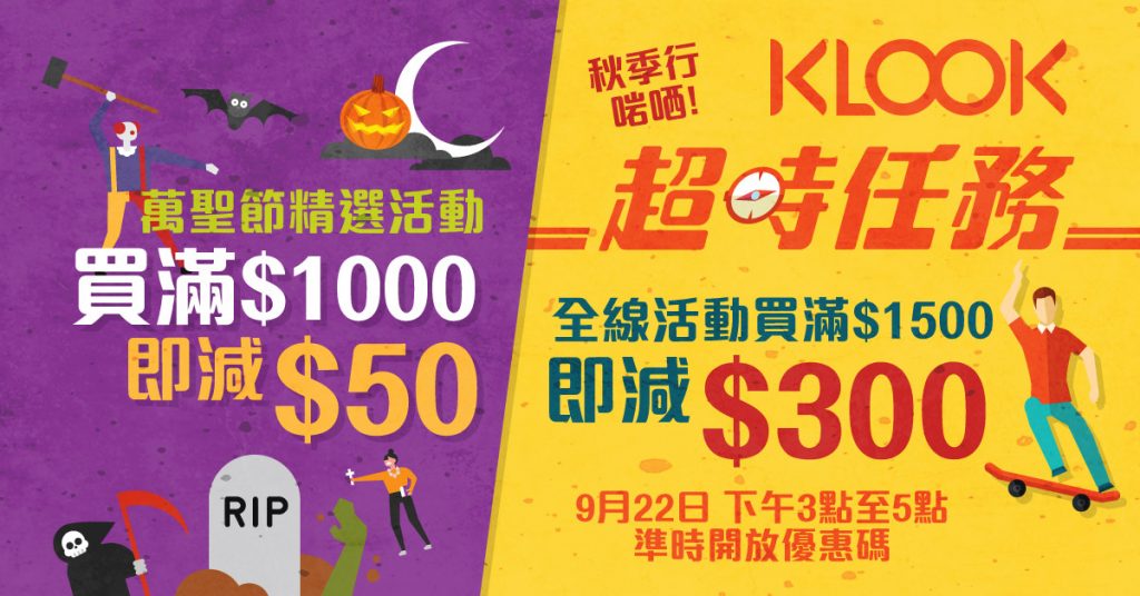 3周年超級優惠星期五!全線行程、景點活動門票、交通票券滿$1,500即減$300!指定萬聖節活動滿$1,000減$50 – Klook